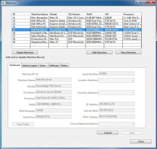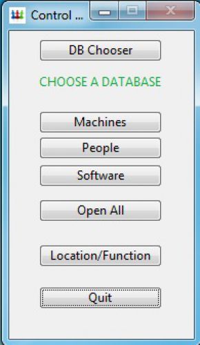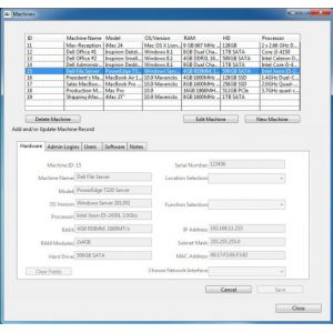 Once launched you will be presented with the button palette you see here. This is the main "control panel" and the first thing you need to do is open and existing client database or create a new client database. Each client has it's own database file. There is an example database the is included and which is shown here. There is a list of machines at the top. If you click on one you will see the selected machine's details in the are below. You can click on the tabs to see the data in each section: Hardware, Software, Users, Admin Logins, and Notes. You cannot change the data.