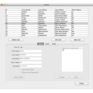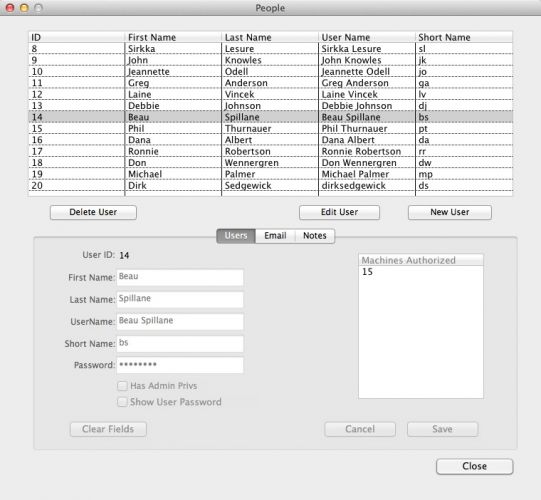 The People window is used to maintain data about users. This includes their email as well as their login credentials. Once the data is entered users can be drag and dropped onto a machine.